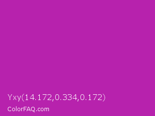Yxy 14.172,0.334,0.172 Color is a normal magenta color and the nearest color is Byzantine #bd33a4. Hex code #b722ad and RGB value is rgb(183,34,173). In RGB color space, this color is composed of 72% red, 13% green, 68% blue, In CMYK color space, this color is composed of 0% cyan, 81% magenta, 5% yellow , 28% black , In HSL color space, this color has a hue angle of 304° , 69% saturation and 43% lightness.