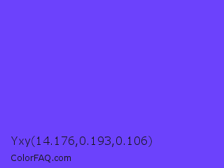 Yxy 14.176,0.193,0.106 Color is a light indigo color and the nearest color is Very Light Blue #6666ff. Hex code #6c42fc and RGB value is rgb(108,66,252). In RGB color space, this color is composed of 42% red, 26% green, 99% blue, In CMYK color space, this color is composed of 57% cyan, 74% magenta, 0% yellow , 1% black , In HSL color space, this color has a hue angle of 254° , 97% saturation and 62% lightness.