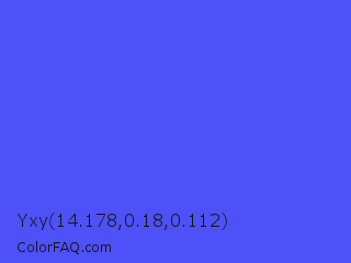 Yxy 14.178,0.18,0.112 Color is a light blue color and the nearest color is Ultramarine Blue #4166f5. Hex code #4d51f7 and RGB value is rgb(77,81,247). In RGB color space, this color is composed of 30% red, 32% green, 97% blue, In CMYK color space, this color is composed of 69% cyan, 67% magenta, 0% yellow , 3% black , In HSL color space, this color has a hue angle of 239° , 91% saturation and 64% lightness.