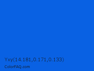 Yxy 14.181,0.171,0.133 Color is a normal blue color and the nearest color is Science Blue #0066cc. Hex code #0961e3 and RGB value is rgb(9,97,227). In RGB color space, this color is composed of 4% red, 38% green, 89% blue, In CMYK color space, this color is composed of 96% cyan, 57% magenta, 0% yellow , 11% black , In HSL color space, this color has a hue angle of 216° , 92% saturation and 46% lightness.
