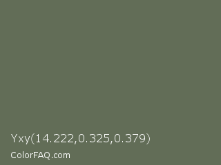 Yxy 14.222,0.325,0.379 Color is a normal green color and the nearest color is Siam #646a54. Hex code #626d57 and RGB value is rgb(98,109,87). In RGB color space, this color is composed of 38% red, 43% green, 34% blue, In CMYK color space, this color is composed of 10% cyan, 0% magenta, 20% yellow , 57% black , In HSL color space, this color has a hue angle of 90° , 11% saturation and 38% lightness.