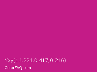 Yxy 14.224,0.417,0.216 Color is a normal magenta color and the nearest color is Red Violet #c71585. Hex code #c41b87 and RGB value is rgb(196,27,135). In RGB color space, this color is composed of 77% red, 11% green, 53% blue, In CMYK color space, this color is composed of 0% cyan, 86% magenta, 31% yellow , 23% black , In HSL color space, this color has a hue angle of 322° , 76% saturation and 44% lightness.