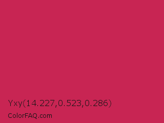Yxy 14.227,0.523,0.286 Color is a normal rose color and the nearest color is Rose Red #c21e56. Hex code #c82553 and RGB value is rgb(200,37,83). In RGB color space, this color is composed of 78% red, 15% green, 33% blue, In CMYK color space, this color is composed of 0% cyan, 82% magenta, 59% yellow , 22% black , In HSL color space, this color has a hue angle of 343° , 69% saturation and 46% lightness.