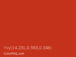 Yxy 14.231,0.593,0.346 Color is a normal red color and the nearest color is Thunderbird #c02b18. Hex code #c5321b and RGB value is rgb(197,50,27). In RGB color space, this color is composed of 77% red, 20% green, 11% blue, In CMYK color space, this color is composed of 0% cyan, 75% magenta, 86% yellow , 23% black , In HSL color space, this color has a hue angle of 8° , 76% saturation and 44% lightness.