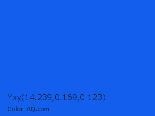 Yxy 14.239,0.169,0.123 Color is a normal blue color and the nearest color is Blue Ribbon #0066ff. Hex code #135eed and RGB value is rgb(19,94,237). In RGB color space, this color is composed of 7% red, 37% green, 93% blue, In CMYK color space, this color is composed of 92% cyan, 60% magenta, 0% yellow , 7% black , In HSL color space, this color has a hue angle of 219° , 86% saturation and 50% lightness.
