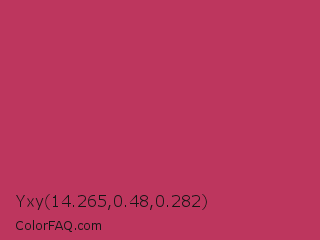 Yxy 14.265,0.48,0.282 Color is a normal rose color and the nearest color is Rich Maroon #b03060. Hex code #bd365e and RGB value is rgb(189,54,94). In RGB color space, this color is composed of 74% red, 21% green, 37% blue, In CMYK color space, this color is composed of 0% cyan, 71% magenta, 50% yellow , 26% black , In HSL color space, this color has a hue angle of 342° , 56% saturation and 48% lightness.