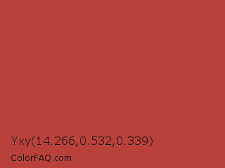 Yxy 14.266,0.532,0.339 Color is a normal red color and the nearest color is Medium Carmine #af4035. Hex code #b84139 and RGB value is rgb(184,65,57). In RGB color space, this color is composed of 72% red, 25% green, 22% blue, In CMYK color space, this color is composed of 0% cyan, 65% magenta, 69% yellow , 28% black , In HSL color space, this color has a hue angle of 4° , 53% saturation and 47% lightness.