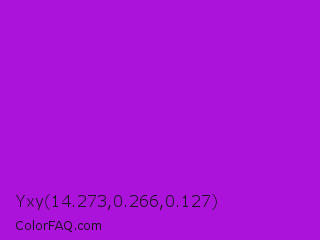Yxy 14.273,0.266,0.127 Color is a normal purple color and the nearest color is Vivid Mulberry #b80ce3. Hex code #ab13db and RGB value is rgb(171,19,219). In RGB color space, this color is composed of 67% red, 7% green, 86% blue, In CMYK color space, this color is composed of 22% cyan, 91% magenta, 0% yellow , 14% black , In HSL color space, this color has a hue angle of 286° , 84% saturation and 47% lightness.