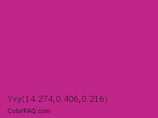 Yxy 14.274,0.406,0.216 Color is a normal magenta color and the nearest color is Royal Fuchsia #ca2c92. Hex code #c02589 and RGB value is rgb(192,37,137). In RGB color space, this color is composed of 75% red, 15% green, 54% blue, In CMYK color space, this color is composed of 0% cyan, 81% magenta, 29% yellow , 25% black , In HSL color space, this color has a hue angle of 321° , 68% saturation and 45% lightness.