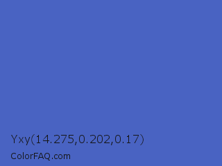 Yxy 14.275,0.202,0.17 Color is a normal blue color and the nearest color is Indigo #4f69c6. Hex code #4963c2 and RGB value is rgb(73,99,194). In RGB color space, this color is composed of 29% red, 39% green, 76% blue, In CMYK color space, this color is composed of 62% cyan, 49% magenta, 0% yellow , 24% black , In HSL color space, this color has a hue angle of 227° , 50% saturation and 52% lightness.