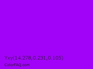 Yxy 14.278,0.231,0.105 Color is a normal purple color and the nearest color is Vivid Violet #9f00ff. Hex code #9f03f8 and RGB value is rgb(159,3,248). In RGB color space, this color is composed of 62% red, 1% green, 97% blue, In CMYK color space, this color is composed of 36% cyan, 99% magenta, 0% yellow , 3% black , In HSL color space, this color has a hue angle of 278° , 98% saturation and 49% lightness.