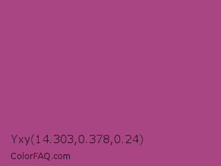 Yxy 14.303,0.378,0.24 Color is a normal magenta color and the nearest color is Mystic Maroon #ad4379. Hex code #a94582 and RGB value is rgb(169,69,130). In RGB color space, this color is composed of 66% red, 27% green, 51% blue, In CMYK color space, this color is composed of 0% cyan, 59% magenta, 23% yellow , 34% black , In HSL color space, this color has a hue angle of 323° , 42% saturation and 47% lightness.