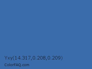 Yxy 14.317,0.208,0.209 Color is a normal blue color and the nearest color is San Marino #456cac. Hex code #3a6baa and RGB value is rgb(58,107,170). In RGB color space, this color is composed of 23% red, 42% green, 67% blue, In CMYK color space, this color is composed of 66% cyan, 37% magenta, 0% yellow , 33% black , In HSL color space, this color has a hue angle of 214° , 49% saturation and 45% lightness.