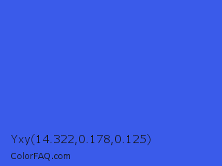 Yxy 14.322,0.178,0.125 Color is a normal blue color and the nearest color is Ultramarine Blue #4166f5. Hex code #3a5bea and RGB value is rgb(58,91,234). In RGB color space, this color is composed of 23% red, 36% green, 92% blue, In CMYK color space, this color is composed of 75% cyan, 61% magenta, 0% yellow , 8% black , In HSL color space, this color has a hue angle of 229° , 81% saturation and 57% lightness.