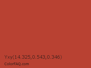 Yxy 14.325,0.543,0.346 Color is a normal red color and the nearest color is Mojo #c04737. Hex code #b94132 and RGB value is rgb(185,65,50). In RGB color space, this color is composed of 73% red, 25% green, 20% blue, In CMYK color space, this color is composed of 0% cyan, 65% magenta, 73% yellow , 27% black , In HSL color space, this color has a hue angle of 7° , 57% saturation and 46% lightness.