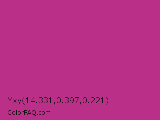 Yxy 14.331,0.397,0.221 Color is a normal magenta color and the nearest color is Medium Red Violet #bb3385. Hex code #ba3088 and RGB value is rgb(186,48,136). In RGB color space, this color is composed of 73% red, 19% green, 53% blue, In CMYK color space, this color is composed of 0% cyan, 74% magenta, 27% yellow , 27% black , In HSL color space, this color has a hue angle of 322° , 59% saturation and 46% lightness.