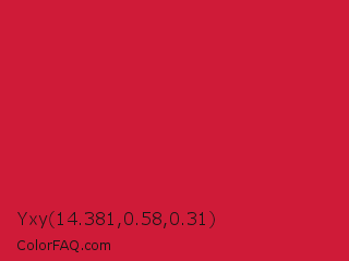 Yxy 14.381,0.58,0.31 Color is a normal red color and the nearest color is Cardinal #c41e3a. Hex code #cf1b38 and RGB value is rgb(207,27,56). In RGB color space, this color is composed of 81% red, 11% green, 22% blue, In CMYK color space, this color is composed of 0% cyan, 87% magenta, 73% yellow , 19% black , In HSL color space, this color has a hue angle of 350° , 77% saturation and 46% lightness.