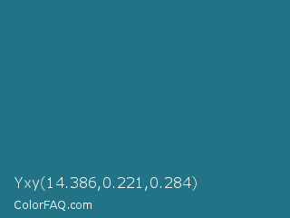 Yxy 14.386,0.221,0.284 Color is a normal cyan color and the nearest color is Elm #1c7c7d. Hex code #237387 and RGB value is rgb(35,115,135). In RGB color space, this color is composed of 14% red, 45% green, 53% blue, In CMYK color space, this color is composed of 74% cyan, 15% magenta, 0% yellow , 47% black , In HSL color space, this color has a hue angle of 192° , 59% saturation and 33% lightness.