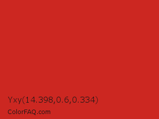 Yxy 14.398,0.6,0.334 Color is a normal red color and the nearest color is Fire Engine Red #ce2029. Hex code #cc2721 and RGB value is rgb(204,39,33). In RGB color space, this color is composed of 80% red, 15% green, 13% blue, In CMYK color space, this color is composed of 0% cyan, 81% magenta, 84% yellow , 20% black , In HSL color space, this color has a hue angle of 2° , 72% saturation and 46% lightness.