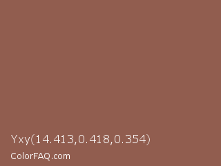 Yxy 14.413,0.418,0.354 Color is a normal red color and the nearest color is Spicy Mix #8b5f4d. Hex code #915d4f and RGB value is rgb(145,93,79). In RGB color space, this color is composed of 57% red, 36% green, 31% blue, In CMYK color space, this color is composed of 0% cyan, 36% magenta, 46% yellow , 43% black , In HSL color space, this color has a hue angle of 13° , 29% saturation and 44% lightness.