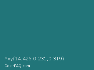 Yxy 14.426,0.231,0.319 Color is a dark cyan color and the nearest color is Elm #1c7c7d. Hex code #217579 and RGB value is rgb(33,117,121). In RGB color space, this color is composed of 13% red, 46% green, 47% blue, In CMYK color space, this color is composed of 73% cyan, 3% magenta, 0% yellow , 53% black , In HSL color space, this color has a hue angle of 183° , 57% saturation and 30% lightness.