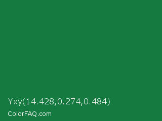Yxy 14.428,0.274,0.484 Color is a dark green color and the nearest color is Dark Spring Green #177245. Hex code #147a40 and RGB value is rgb(20,122,64). In RGB color space, this color is composed of 8% red, 48% green, 25% blue, In CMYK color space, this color is composed of 84% cyan, 0% magenta, 48% yellow , 52% black , In HSL color space, this color has a hue angle of 146° , 72% saturation and 28% lightness.