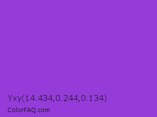 Yxy 14.434,0.244,0.134 Color is a normal purple color and the nearest color is Dark Orchid #9932cc. Hex code #943bd9 and RGB value is rgb(148,59,217). In RGB color space, this color is composed of 58% red, 23% green, 85% blue, In CMYK color space, this color is composed of 32% cyan, 73% magenta, 0% yellow , 15% black , In HSL color space, this color has a hue angle of 274° , 68% saturation and 54% lightness.