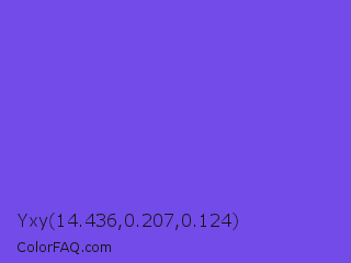 Yxy 14.436,0.207,0.124 Color is a normal indigo color and the nearest color is Majorelle Blue #6050dc. Hex code #734be8 and RGB value is rgb(115,75,232). In RGB color space, this color is composed of 45% red, 29% green, 91% blue, In CMYK color space, this color is composed of 50% cyan, 68% magenta, 0% yellow , 9% black , In HSL color space, this color has a hue angle of 255° , 77% saturation and 60% lightness.