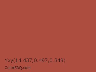 Yxy 14.437,0.497,0.349 Color is a normal red color and the nearest color is Apple Blossom #af4d43. Hex code #ac4d3f and RGB value is rgb(172,77,63). In RGB color space, this color is composed of 67% red, 30% green, 25% blue, In CMYK color space, this color is composed of 0% cyan, 55% magenta, 63% yellow , 33% black , In HSL color space, this color has a hue angle of 8° , 46% saturation and 46% lightness.