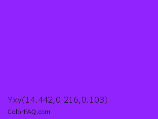 Yxy 14.442,0.216,0.103 Color is a normal violet color and the nearest color is Veronica #a020f0. Hex code #9123ff and RGB value is rgb(145,35,255). In RGB color space, this color is composed of 57% red, 14% green, 100% blue, In CMYK color space, this color is composed of 43% cyan, 86% magenta, 0% yellow , 0% black , In HSL color space, this color has a hue angle of 270° , 100% saturation and 57% lightness.