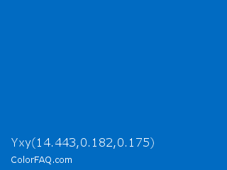 Yxy 14.443,0.182,0.175 Color is a normal blue color and the nearest color is French Blue #0072bb. Hex code #016bc2 and RGB value is rgb(1,107,194). In RGB color space, this color is composed of 0% red, 42% green, 76% blue, In CMYK color space, this color is composed of 99% cyan, 45% magenta, 0% yellow , 24% black , In HSL color space, this color has a hue angle of 207° , 99% saturation and 38% lightness.