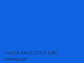 Yxy 14.444,0.173,0.138 Color is a normal blue color and the nearest color is Bright Navy Blue #1974d2. Hex code #1063e0 and RGB value is rgb(16,99,224). In RGB color space, this color is composed of 6% red, 39% green, 88% blue, In CMYK color space, this color is composed of 93% cyan, 56% magenta, 0% yellow , 12% black , In HSL color space, this color has a hue angle of 216° , 87% saturation and 47% lightness.