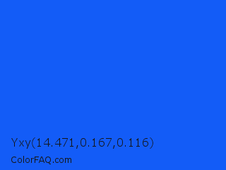 Yxy 14.471,0.167,0.116 Color is a normal blue color and the nearest color is Blue Ribbon #0066ff. Hex code #135cf7 and RGB value is rgb(19,92,247). In RGB color space, this color is composed of 7% red, 36% green, 97% blue, In CMYK color space, this color is composed of 92% cyan, 63% magenta, 0% yellow , 3% black , In HSL color space, this color has a hue angle of 221° , 93% saturation and 52% lightness.