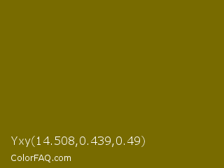 Yxy 14.508,0.439,0.49 Color is a dark yellow color and the nearest color is Bronze Yellow #737000. Hex code #786b00 and RGB value is rgb(120,107,0). In RGB color space, this color is composed of 47% red, 42% green, 0% blue, In CMYK color space, this color is composed of 0% cyan, 11% magenta, 100% yellow , 53% black , In HSL color space, this color has a hue angle of 54° , 100% saturation and 24% lightness.