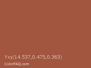 Yxy 14.537,0.475,0.363 Color is a normal red color and the nearest color is Sepia Skin #9e5b40. Hex code #a2553f and RGB value is rgb(162,85,63). In RGB color space, this color is composed of 64% red, 33% green, 25% blue, In CMYK color space, this color is composed of 0% cyan, 48% magenta, 61% yellow , 36% black , In HSL color space, this color has a hue angle of 13° , 44% saturation and 44% lightness.