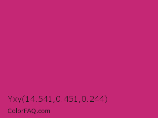 Yxy 14.541,0.451,0.244 Color is a normal rose color and the nearest color is Magenta Dye #ca1f7b. Hex code #c52775 and RGB value is rgb(197,39,117). In RGB color space, this color is composed of 77% red, 15% green, 46% blue, In CMYK color space, this color is composed of 0% cyan, 80% magenta, 41% yellow , 23% black , In HSL color space, this color has a hue angle of 330° , 67% saturation and 46% lightness.