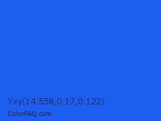 Yxy 14.558,0.17,0.122 Color is a normal blue color and the nearest color is Blue Crayola #1f75fe. Hex code #1d5ef0 and RGB value is rgb(29,94,240). In RGB color space, this color is composed of 11% red, 37% green, 94% blue, In CMYK color space, this color is composed of 88% cyan, 61% magenta, 0% yellow , 6% black , In HSL color space, this color has a hue angle of 222° , 88% saturation and 53% lightness.