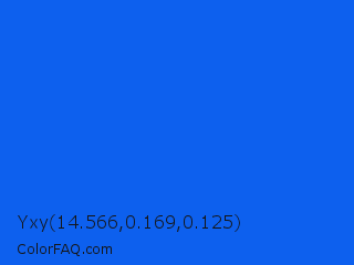 Yxy 14.566,0.169,0.125 Color is a normal blue color and the nearest color is Blue Ribbon #0066ff. Hex code #0d60ee and RGB value is rgb(13,96,238). In RGB color space, this color is composed of 5% red, 38% green, 93% blue, In CMYK color space, this color is composed of 95% cyan, 60% magenta, 0% yellow , 7% black , In HSL color space, this color has a hue angle of 218° , 90% saturation and 49% lightness.