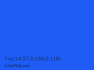 Yxy 14.57,0.169,0.118 Color is a normal blue color and the nearest color is Blue Crayola #1f75fe. Hex code #1e5cf5 and RGB value is rgb(30,92,245). In RGB color space, this color is composed of 12% red, 36% green, 96% blue, In CMYK color space, this color is composed of 88% cyan, 62% magenta, 0% yellow , 4% black , In HSL color space, this color has a hue angle of 223° , 91% saturation and 54% lightness.