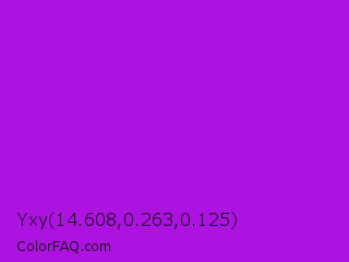 Yxy 14.608,0.263,0.125 Color is a normal purple color and the nearest color is Vivid Mulberry #b80ce3. Hex code #ac12e0 and RGB value is rgb(172,18,224). In RGB color space, this color is composed of 67% red, 7% green, 88% blue, In CMYK color space, this color is composed of 23% cyan, 92% magenta, 0% yellow , 12% black , In HSL color space, this color has a hue angle of 285° , 85% saturation and 47% lightness.