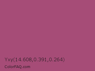 Yxy 14.608,0.391,0.264 Color is a normal rose color and the nearest color is Magenta Haze #9f4576. Hex code #a64c77 and RGB value is rgb(166,76,119). In RGB color space, this color is composed of 65% red, 30% green, 47% blue, In CMYK color space, this color is composed of 0% cyan, 54% magenta, 28% yellow , 35% black , In HSL color space, this color has a hue angle of 331° , 37% saturation and 47% lightness.