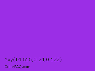 Yxy 14.616,0.24,0.122 Color is a normal purple color and the nearest color is Blue Violet #8a2be2. Hex code #9b2ee6 and RGB value is rgb(155,46,230). In RGB color space, this color is composed of 61% red, 18% green, 90% blue, In CMYK color space, this color is composed of 33% cyan, 80% magenta, 0% yellow , 10% black , In HSL color space, this color has a hue angle of 276° , 79% saturation and 54% lightness.