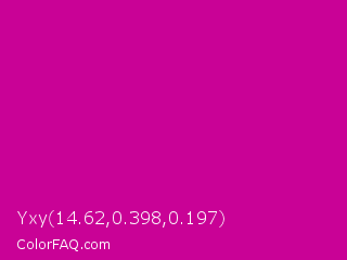 Yxy 14.62,0.398,0.197 Color is a normal magenta color and the nearest color is Red Violet #c71585. Hex code #c90296 and RGB value is rgb(201,2,150). In RGB color space, this color is composed of 79% red, 1% green, 59% blue, In CMYK color space, this color is composed of 0% cyan, 99% magenta, 25% yellow , 21% black , In HSL color space, this color has a hue angle of 315° , 98% saturation and 40% lightness.