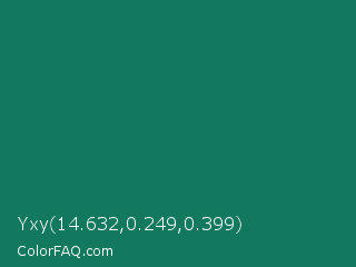 Yxy 14.632,0.249,0.399 Color is a dark cyan color and the nearest color is Deep Green Cyan Turquoise #0e7c61. Hex code #13795e and RGB value is rgb(19,121,94). In RGB color space, this color is composed of 7% red, 47% green, 37% blue, In CMYK color space, this color is composed of 84% cyan, 0% magenta, 22% yellow , 53% black , In HSL color space, this color has a hue angle of 164° , 73% saturation and 27% lightness.