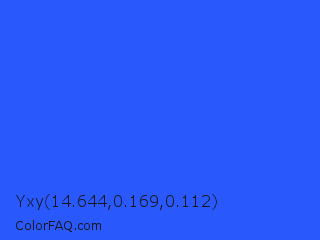 Yxy 14.644,0.169,0.112 Color is a normal blue color and the nearest color is Ultramarine Blue #4166f5. Hex code #2959fc and RGB value is rgb(41,89,252). In RGB color space, this color is composed of 16% red, 35% green, 99% blue, In CMYK color space, this color is composed of 84% cyan, 65% magenta, 0% yellow , 1% black , In HSL color space, this color has a hue angle of 226° , 97% saturation and 57% lightness.