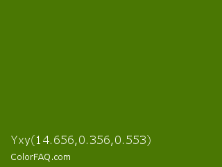 Yxy 14.656,0.356,0.553 Color is a dark green color and the nearest color is Avocado #568203. Hex code #4a7703 and RGB value is rgb(74,119,3). In RGB color space, this color is composed of 29% red, 47% green, 1% blue, In CMYK color space, this color is composed of 38% cyan, 0% magenta, 97% yellow , 53% black , In HSL color space, this color has a hue angle of 83° , 95% saturation and 24% lightness.