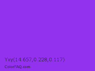 Yxy 14.657,0.228,0.117 Color is a normal purple color and the nearest color is Blue Violet #8a2be2. Hex code #9332ee and RGB value is rgb(147,50,238). In RGB color space, this color is composed of 58% red, 20% green, 93% blue, In CMYK color space, this color is composed of 38% cyan, 79% magenta, 0% yellow , 7% black , In HSL color space, this color has a hue angle of 271° , 85% saturation and 56% lightness.