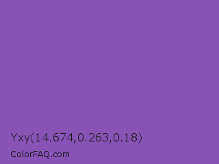 Yxy 14.674,0.263,0.18 Color is a normal purple color and the nearest color is Fuchsia Blue #7a58c1. Hex code #8753b5 and RGB value is rgb(135,83,181). In RGB color space, this color is composed of 53% red, 33% green, 71% blue, In CMYK color space, this color is composed of 25% cyan, 54% magenta, 0% yellow , 29% black , In HSL color space, this color has a hue angle of 272° , 40% saturation and 52% lightness.