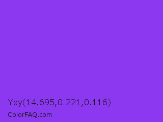 Yxy 14.695,0.221,0.116 Color is a normal violet color and the nearest color is Blue Violet #8a2be2. Hex code #8c38f0 and RGB value is rgb(140,56,240). In RGB color space, this color is composed of 55% red, 22% green, 94% blue, In CMYK color space, this color is composed of 42% cyan, 77% magenta, 0% yellow , 6% black , In HSL color space, this color has a hue angle of 267° , 86% saturation and 58% lightness.