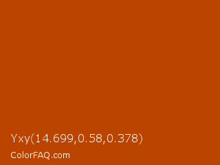 Yxy 14.699,0.58,0.378 Color is a normal orange color and the nearest color is Mahogany #c04000. Hex code #bb4400 and RGB value is rgb(187,68,0). In RGB color space, this color is composed of 73% red, 27% green, 0% blue, In CMYK color space, this color is composed of 0% cyan, 64% magenta, 100% yellow , 27% black , In HSL color space, this color has a hue angle of 22° , 100% saturation and 37% lightness.